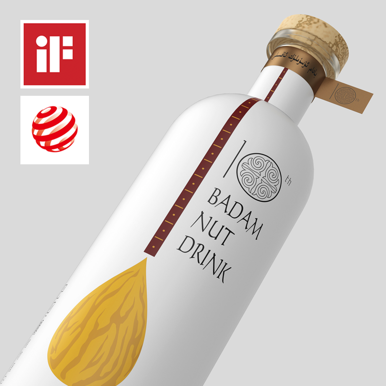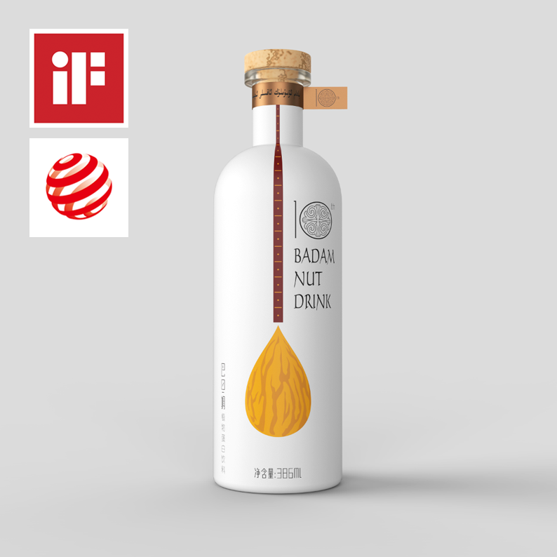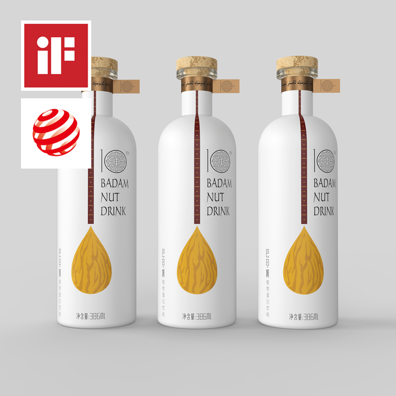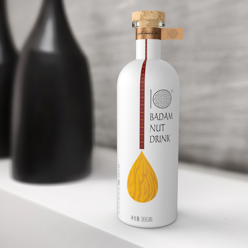 The creative idea of dominant visual pattern is from dutar , which is the ethnic musical instruments of Xinjiang. The badam on the bottom of the fingerboard is just like the body of instruments, which directly tell us the product attributes. The design of bottle shape is fashionable, bottle cap uses rustic quality wooden plug. Uyghur characters are written on the neck ring paper seal, which enhance regional and ethnic characteristics. The 10th anniversary font design also adopts uyghur traditional patterns. It leaves consumers the brand of Xinjiang specialty, and the charm of modern visual design is fully demonstrated by the products.